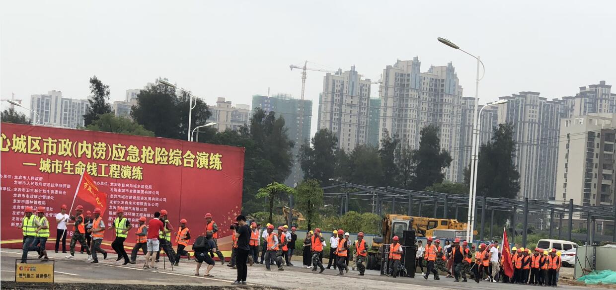 演練情景模擬近期持續(xù)降雨造成龍巖大道與工業(yè)路交叉口立交工程項目下穿通道嚴重內(nèi)積水,影響邊坡安全,在搶修過程中,發(fā)現(xiàn)下穿通道西側(cè)邊坡失穩(wěn),坡下燃氣管道發(fā)生泄漏以及供水管網(wǎng)破損,邊坡樹木傾斜,一名人員被樹壓倒,并有一名人員受傷9時40分,龍巖市住房和城鄉(xiāng)建設局副調(diào)研員林紅強總指揮下達開始演練命令,各參演單位應急搶險隊伍、龍吸水抽排等搶險設備、救護車輛等迅速按照應急演練方案緊急出動。各搶險單位接到搶險指令后,快速響應,迅速調(diào)集搶險車輛和應急物資,在規(guī)定時間內(nèi)趕到搶險現(xiàn)場,快速有效實施現(xiàn)場搶險,設置警戒線封鎖積水現(xiàn)場道路,安放警示標志牌提醒行人車輛繞道通行,啟動龍吸水等搶險設備抽排積水,并對堵塞管道進行疏通等。
