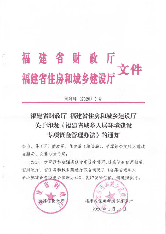 福建省財政廳福建省住房和城鄉(xiāng)建設(shè)廳關(guān)于印發(fā)《福建省城鄉(xiāng)人居環(huán)境建設(shè)專項資金管理辦法的通知》(閩財建[2020]3號)